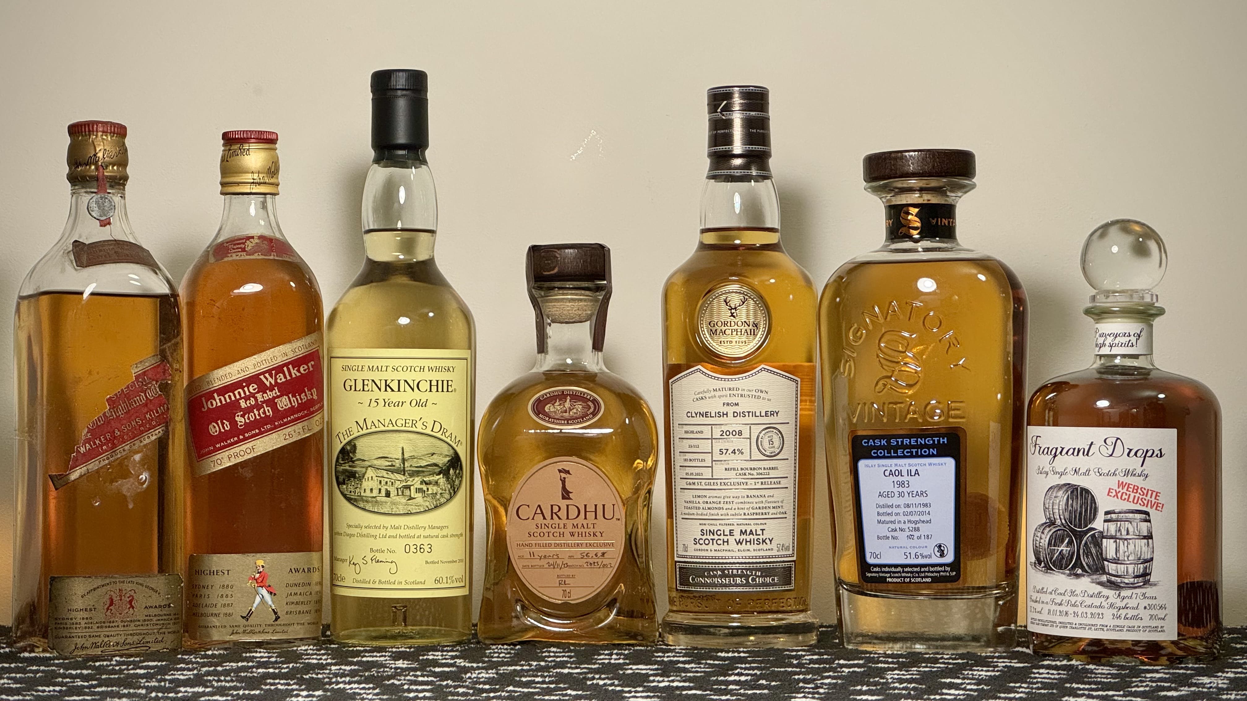 The theme of this tasting is a deconstruction of the ubiquitous Johnnie Walker Red Label blended scotch whisky, featuring integrity expressions of the so-called "Four Corners of Scotland" that compose Johnnie Walker Red, as well as two old expressions of JW Red itself.